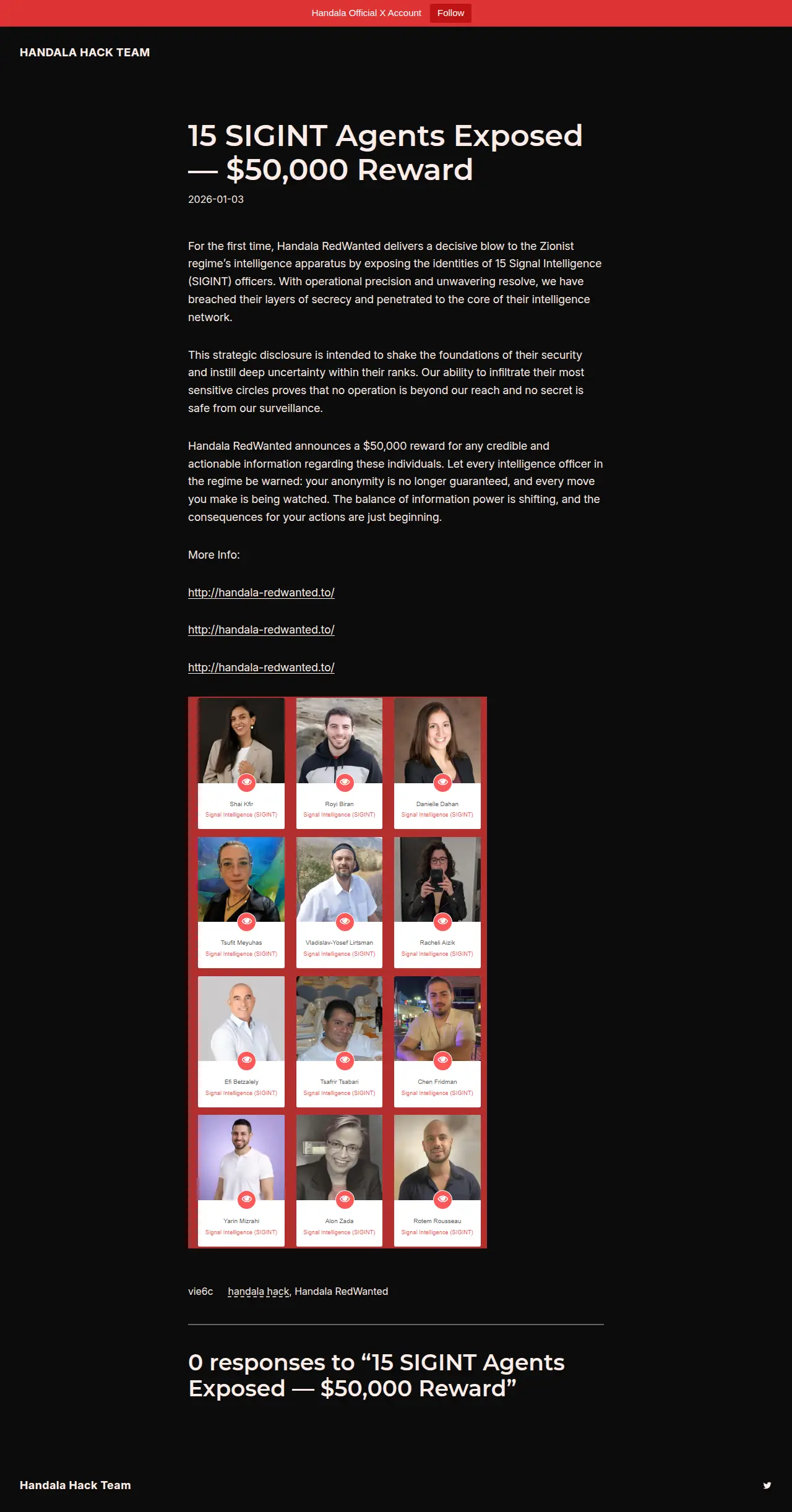 2026-01-03 15 SIGINT Agents Exposed — $50,000 Reward For the first time, Handala RedWanted delivers a decisive blow to the Zionist regime’s intelligence apparatus by exposing the identities of 15 Signal Intelligence (SIGINT) officers. With operational precision and unwavering resolve, we have breached their layers of secrecy and penetrated to the core of their intelligence network. This strategic disclosure is intended to shake… image