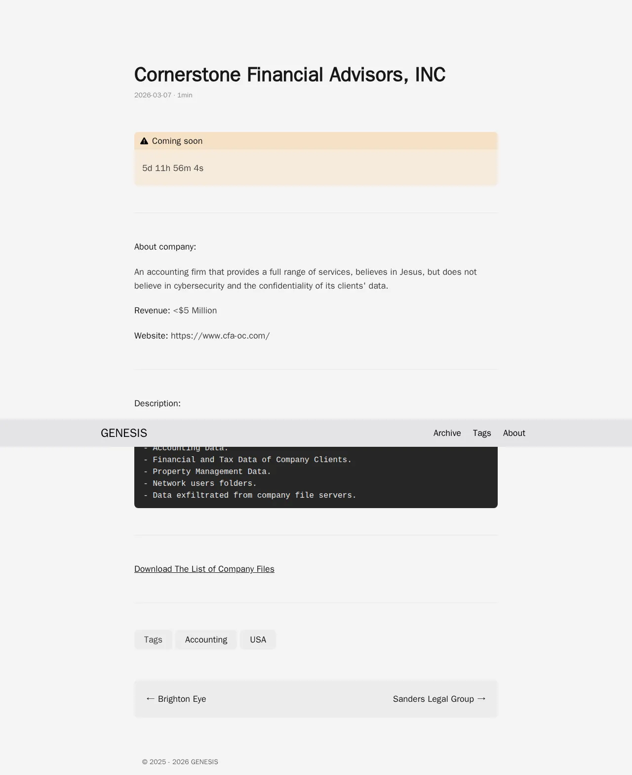 2025-10-21 Austin Capital Trust About company: Austin Capital Trust Company, LLC is a Nevada-chartered trust company that offers a range of financial services including trust and custody, retirement plan services, turnkey asset management, and a unified managed household platform. Revenue: $5 Million Website: https://www.austincapitaltrust.com info Our Summary: This network also contains databases belonging to another company, FinTech Automation, which is linked to the founders and executives of published company. We want to highlight that personal data at both organizations is stored almost everywhere on file servers, systems logs, product folders, technical and personal folders, which is a violation of data protection rules. This is grounds for the Attorney General and the Federal Trade Commission to investigate this breach, as the organization's customers' personal and financial files are stored without any protection in accordance with regulations or even basic compliance standards. There is no encryption, no access separation, no data transfer monitoring, nothing reasonable. Description: - 500 GB of accessible data. - Data from the company's file server. - Network user data. - Large amounts of personal data of all kinds. - Medical and financial data. - Data from Fintech Automation. - Data from Mora Law. - Business and operational data, structured financial data. - System logs. image