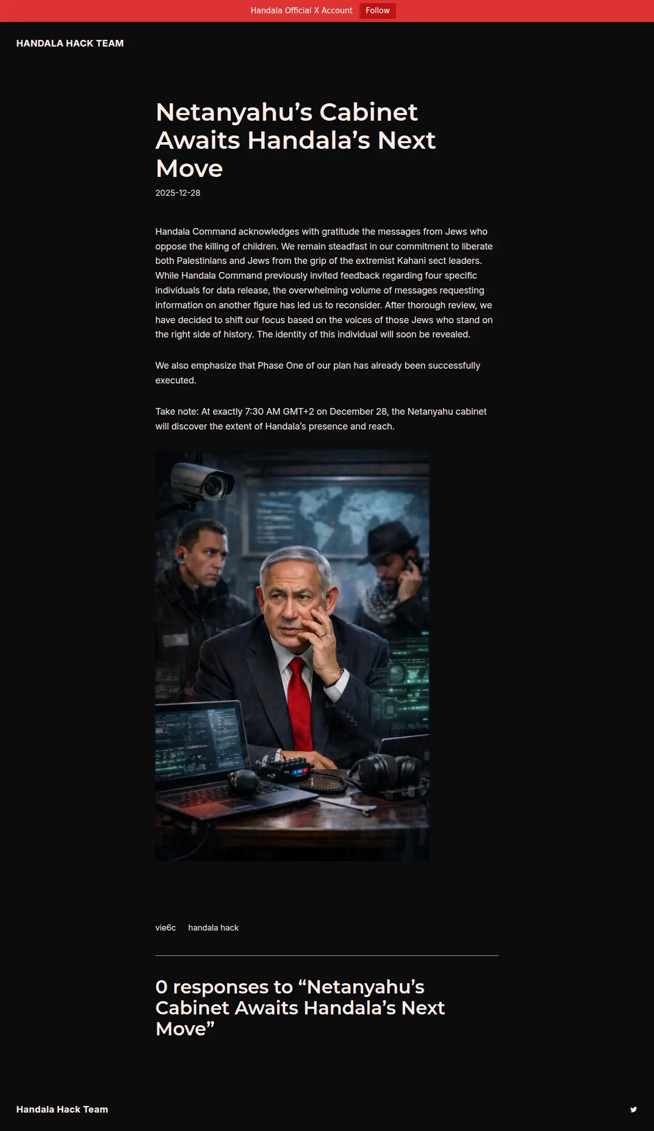 2025-12-27 Netanyahu’s Cabinet Awaits Handala’s Next Move Handala Command acknowledges with gratitude the messages from Jews who oppose the killing of children. We remain steadfast in our commitment to liberate both Palestinians and Jews from the grip of the extremist Kahani sect leaders. While Handala Command previously invited feedback regarding four specific individuals for data release, the overwhelming volume of messages requesting… image
