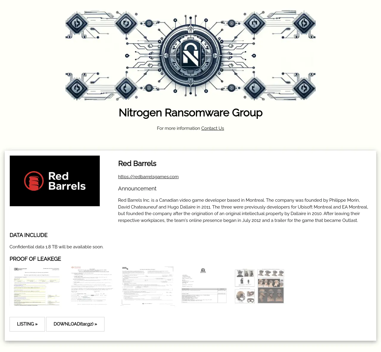 Red Barrels Inc. is a Canadian video game developer based in Montreal. The company was founded by Philippe Morin, David Chateauneuf and Hugo Dallaire in 2011. The three were previously developers for Ubisoft Montreal and EA Montreal, but founded the company after the origination of an original intellectual property by Dallaire in 2010. After leaving their respective workplaces, the team's online presence began in July 2012 and a trailer for the game that became Outlast. |